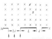 利用如圖所示裝置可以選擇一定速度范圍內(nèi)的帶電粒子。圖中板MN上方是磁感應(yīng)強(qiáng)度大小為B、方向垂直紙面向里的勻強(qiáng)磁場,板上有兩條寬度分別為2d和d的縫,兩縫近端相距為L。一群質(zhì)量為m、電荷量為q,具有不同速度的粒子從寬度為2d的縫垂直于板MN進(jìn)入磁場,對(duì)于能夠從寬度為d的縫射出的粒子,下列說法正確的是( )