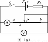 為測定某電源的電動勢E和內(nèi)阻r,以及一段電阻絲的電阻率ρ,設(shè)計了如右圖(a)所示的電路.a(chǎn)b是一段電阻率較大的粗細(xì)均勻的電阻絲,R0是阻值為2Ω的保護電阻,滑動片P與電阻絲接觸始終良好.