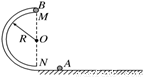(9分)如圖所示,圓管構成的半圓形軌道豎直固定在水平地面上,軌道半徑為R,MN為直徑且與水平面垂直,直徑略小于圓管內徑的小球A以某一速度沖進軌道,到達半圓軌道最高點M時與靜止于該處的質量與A相同的小球B發(fā)生碰撞,碰后兩球粘在一起飛出軌道,落地點距N為2R。重力加速度為g,忽略圓管內徑,空氣阻力及各處摩擦均不計。求: