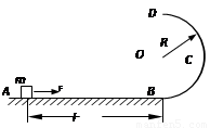 如圖所示,豎直放置的半徑R=0.4m的半圓形光滑軌道BCD跟水平直軌道AB相切于B點,D點為半圓形軌道的最高點?梢暈橘|(zhì)點的物塊m=0.5kg,靜止在水平軌道上A點,物塊與軌道AB間的動摩擦因數(shù)為μ=0.2,AB兩點間的距離為l=2m。現(xiàn)給物塊m施以水平向右恒力F作用s=1m 后撤除恒力,物塊滑上圓軌道D點時對軌道壓力大小等于物塊重力。(g取10m/s2)