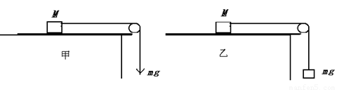 (4分)一端帶有滑輪的木板水平放置在桌面上,木板上放一個質(zhì)量為M的物體,另一端連一不可伸縮的細(xì)線,跨過滑輪按圖甲和圖乙兩種方式拉繩子的另一端使M都能加速運動,不計滑輪質(zhì)量和摩擦,則繩子上的拉力比較:圖甲 圖乙(填大于、小于、等于)