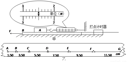 __ N,A、B間的動摩擦因數(shù)μ= 。(g取10m/s2)。該同學(xué)還將紙帶連接在金屬板B的后面,通過打點計時器連續(xù)打下一系列的點,測量結(jié)果如圖乙所示,圖中各計數(shù)點間的時間間隔為0.1s,可求得拉金屬板的水平力F=
