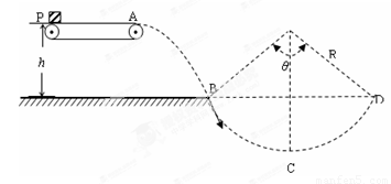 (16分)如圖所示,在水平勻速運動的傳送帶的左端(P點),輕放一質(zhì)量為m=1kg的物塊,物塊隨傳送帶運動到A點后拋出,物塊恰好無碰撞地沿圓弧切線從B點進(jìn)入豎直光滑圓弧軌道下滑。B、D為圓弧的兩端點,其連線水平。已知圓弧半徑R=1.0m,圓弧對應(yīng)的圓心角θ=106º,軌道最低點為C,A點距水平面的高度h=0.80m。(g取10m/s2,