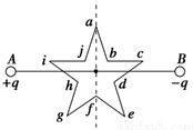 如圖所示,在真空中的A、B兩點(diǎn)分別放置等量異種點(diǎn)電荷,在A、B兩點(diǎn)間取一正五角星形路徑abcdefghija,五角星的中心與A、B的中點(diǎn)重合,其中af連線與AB連線垂直.現(xiàn)將一電子沿該路徑逆時(shí)針移動(dòng)一周,下列判斷正確的是( )