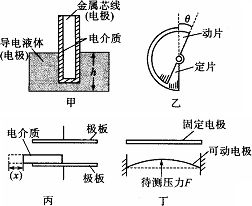 傳感器是把非電學(xué)物理量(如位移、速度、壓力、角度等)轉(zhuǎn)換成電學(xué)物理量(如電壓、電流、電量等)的一種元件.如圖所示中的甲、乙、丙、丁是四種常見的電容式傳感器,下列說法正確的是