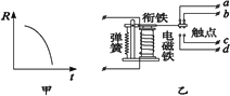 給你的器材有:如實驗圖乙所示的繼電器一只(a、b為常閉觸點,c、d為常開觸點),熱敏電阻一只、滑動變阻器一只、紅綠色指示燈各一個、兩個獨立的電池組、開關兩個、導線若干等,并且請說明滑動變阻器的作用.