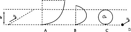 如圖所示,小球以初速度為v0從光滑斜面底部向上滑,恰能到達最大高度為h的斜面頂部.右圖中A是內(nèi)軌半徑大于h的光滑軌道、B是內(nèi)軌半徑小于h的光滑軌道、C是內(nèi)軌半徑等于h光滑軌道、D是斜拋無軌道的運動的小球.小球在底端時的初速度都為v0,則小球在以上四種情況中能到達高度h的有________