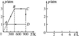 如圖所示,一定質(zhì)量的理想氣體從狀態(tài)A經(jīng)、B、C、D再回到A,問AB、BC、CD、DA是什么過程?已知在狀態(tài)A時容積為1 L,并把此圖改畫為P-V圖.