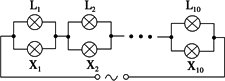 某實(shí)物投影機(jī)有10個(gè)相同的強(qiáng)光燈L1~L10(24 V、200 W)和10個(gè)相同的指示燈X1~X10(220 V、2 W),將其連接在220 V交流電源上,電路如圖.若工作一段時(shí)間后L2燈絲燒斷,則