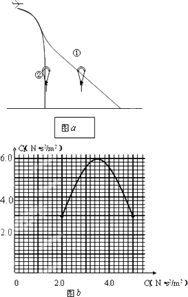翼型降落傘有很好的飛行性能.它有點象是飛機的機翼,跳傘運動員可方便地控制轉彎等動作.其原理是通過對降落傘的調節(jié),使空氣升力和空氣摩擦力都受到影響.已知:空氣升力F1與飛行方向垂直,大小與速度的平方成正比,F(xiàn)1=C1v2;空氣摩擦力F2與飛行方向相反,大小與速度的平方成正比,F(xiàn)2=C2v2.其中C1、C2相互影響,可由運動員調節(jié),滿足如圖b所示的關系.圖a中畫出了運動員攜帶翼型傘跳傘后的兩條大致運動軌跡.運動員和裝備的總質量約為70 kg.其中①軌跡與地面近似成45°,②軌跡與地面垂直.則下列判斷正確的是