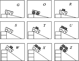 小明希望檢驗這樣一個猜想:從斜面滑下的小車,裝載物體的質量越大,到達斜面底部的速度越快.下圖示為兩種不同直徑車輪(顏色不同),裝有不同木塊(每個木塊的質量相同)從不同高度釋放的小車.你認為小明應該選用哪3種情況進行比較