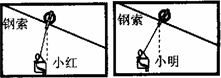 在一種速降娛樂項(xiàng)目中,人乘坐在吊籃中,吊籃通過滑輪沿一條傾斜的鋼索向下滑行.現(xiàn)有兩條彼此平行的鋼索,它們的起、終點(diǎn)分別位于同一高度.小紅和小明分別乘吊籃從速降的起點(diǎn)由靜止開始下滑,在他們下滑過程中,當(dāng)?shù)趸@與滑輪達(dá)到相對(duì)靜止?fàn)顟B(tài)時(shí),分別拍下一張照片,如圖所示.已知二人運(yùn)動(dòng)過程中,空氣阻力的影響可以忽略,則
