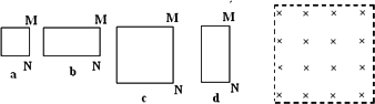 用相同導(dǎo)線繞制的邊長(zhǎng)為L(zhǎng)或2 L的四個(gè)閉合導(dǎo)體線框,以相同的速度勻速進(jìn)入右側(cè)勻強(qiáng)磁場(chǎng),如圖所示.在每個(gè)線框進(jìn)入磁場(chǎng)的過程中,M、N兩點(diǎn)間的電壓分別為Ua、Ub、Uc和Ud.下列判斷正確的是: