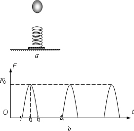 如圖a所示,質(zhì)量不計(jì)的彈簧豎直固定在水平面上,t=0時(shí)刻,將一金屬小球從彈簧正上方某一高度處由靜止釋放,小球落到彈簧上壓縮彈簧到最低點(diǎn),然后又被彈起離開彈簧,上升到一定高度后再下落,如此反復(fù).通過安裝在彈簧下端的壓力傳感器,得到彈簧彈力F隨時(shí)間t變化的圖像如圖b所示,若圖像中的坐標(biāo)值都為已知量,重力加速度為g,則