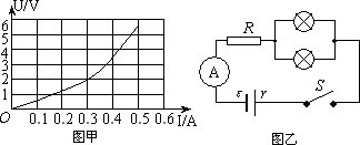 圖甲為某一小燈泡的U-I圖線,現(xiàn)將兩個這樣的小燈泡并聯(lián)后再與一個4 Ω的定值電阻R串聯(lián),接在內(nèi)阻為1 Ω、電動勢為5 V的電源兩端,如圖乙所示.則通過每盞小燈泡的電流強度為________A,此時每盞小燈泡的電功率為________W.