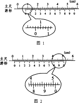 待測電阻是一均勻材料制成的圓柱體,用游標(biāo)為50分度的卡尺測量其長度與直徑,結(jié)果分別如圖1、圖2所示.由圖可知其長度為________,直徑為________.