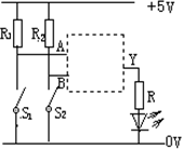 如圖是一個應用某邏輯電路制作的簡單車門報警電路圖.圖中的兩個按鈕S1、S2分別裝在汽車的兩道門上.只要其中任何一個開關(guān)處于開路狀態(tài),發(fā)光二極管(報警燈)就發(fā)光.則該邏輯電路是________門電路,并在圖中畫出這種門電路的符號;當S1、S2都閉合時,A、B的輸入都為________,Y端輸出為________;當S1斷開時,________端的輸入為1,Y端輸出為________.