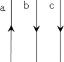 在同一平面上有a、b、c三根等間距平行放置的長直導線,依次載有電流強度為1安、2安和3安的電流,各電流的方向如圖所示.則導線a所受的合力方向向________,導線b所受的合力方向向________.