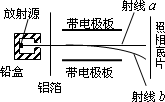 一置于鉛盒中的放射源發(fā)射的a 、b 和g 射線,由鉛盒的小孔射出,在小孔外放一鋁箔后,鋁箔后的空間有一勻強(qiáng)電場(chǎng).進(jìn)入電場(chǎng)后,射線變?yōu)?/FONT>a、b兩束,射線a沿原來(lái)方向行進(jìn),射線b發(fā)生了偏轉(zhuǎn),如圖所示,則圖中的射線a為________射線,射線b為________射線.