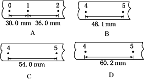 在測定勻變速直線運動的加速度時,得到一條理想紙帶,取5個計時點為一個記數(shù)點,先后編為0、1、2、3、4、5,由于不小心紙帶被撕爛,請根據(jù)給出的A、B、C、D四段紙帶回答: