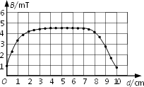在“用DIS研究通電螺線管的磁感應(yīng)強度”的實驗中,用________傳感器測量螺線管的軸線上各點的磁感應(yīng)強度,得到右圖所示的B-d圖線.實驗中使用的螺線管的內(nèi)徑(直徑)為4×10-2 m,根據(jù)圖線估算螺線管中心的磁通量約為________Wb.