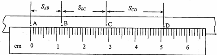 利用打點計時器測定做勻加速直線運動小車的加速度,下圖為某同學實驗時打出的一條紙帶,紙帶上A、B、C、D是每打五次點的時間作為時間單位的計數點,從刻度尺中可以得到SAB=________cm、SCD=________cm,由這兩個數據得出小車的加速度大小a=________m/s2.
