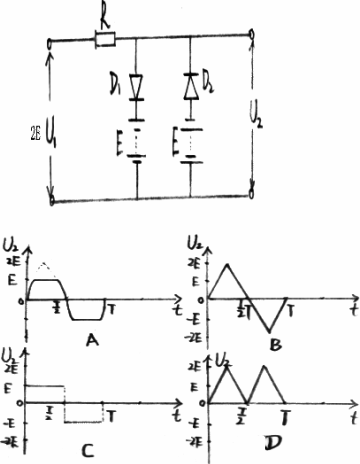 如圖是電子技術中用到的限幅電路,電池組的電動勢都為E,左端輸入的是正弦交流電,電壓U1的最大值為2E,試判斷下列下端輸出的電壓U2的圖象,正確的是( )(說明,二極管有兩個極,正極(+)和負極(-),當正極的電勢高于負極時,二極管導電,當正極的電勢低于負極時,二極管不導電,也就是二極管具有單向導電性,另外電池的內阻略去不計)
