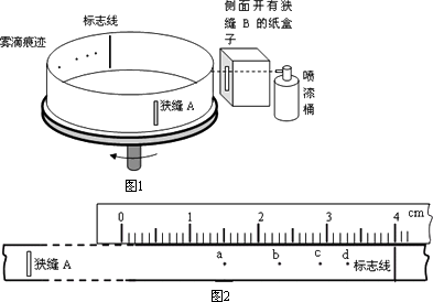 某同學設計了一個測定油漆噴槍向外噴射油漆霧滴速度的實驗.他采用圖所示的裝置,該油漆噴槍能夠向外噴射四種速度大小不同的油漆霧滴,設噴射速度大小為v0.一個直徑為D=40 cm的紙帶環(huán),安放在一個可以按照一定轉速轉動的固定轉臺上,紙帶環(huán)上刻有一條狹縫A,在狹縫A的正對面畫一條標志線.在轉臺開始轉動達到穩(wěn)定轉速時,向側面同樣開有狹縫B的紙盒中噴射油漆霧滴,當狹縫A轉至與狹縫B正對平行時,霧滴便通過狹縫A在紙帶的內側面留下痕跡.改變噴射速度重復實驗,在紙帶上留下一系列的痕跡a、b、c、d.將紙帶從轉臺上取下來,展開平放在刻度尺旁邊,如圖所示.已知
