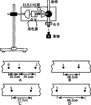 利用圖中所示的裝置,在做“測量重力加速度”的實驗中,得到了幾條較為理想的紙帶.已知每條紙帶上每5個點取一個計數點,即兩計數點之間的時間間隔為0.1 s,依打點先后編為0,1,2,3,4,…….由于不小心,紙帶都被撕斷了,如圖所示,根據給出的A、B、C、D四段紙帶回答: