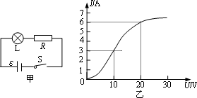 某同學(xué)研究燈泡消耗的電功率與電源的輸出功率的關(guān)系,電路如圖甲所示.已知電阻R=10 Ω.通過(guò)燈的電流與燈兩端電壓關(guān)系如圖乙所示.則當(dāng)P燈與電源的輸出功率P出之比為1∶4時(shí),燈上電壓UL與電阻R上電壓UR之比為________:電路兩端的電壓為________V或________V.