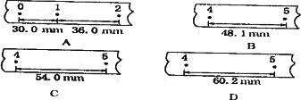 在測(cè)定勻變速直線運(yùn)動(dòng)的加速度時(shí),得到一條理想紙帶,取5個(gè)計(jì)時(shí)點(diǎn)為一個(gè)記數(shù)點(diǎn),先后編為0、1、2、3、4、5,由于不小心紙帶被撕爛,請(qǐng)根據(jù)給出的A,B,C,D四段紙帶回答: