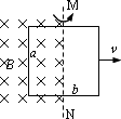 如圖,長(zhǎng)為a、寬為b的矩形線框的左半側(cè)處在磁感應(yīng)強(qiáng)度為B的勻強(qiáng)磁場(chǎng)中,磁場(chǎng)方向與線框平面垂直,線框的對(duì)稱軸MN恰與磁場(chǎng)邊緣平齊.若第一次將線框從磁場(chǎng)中以恒定速度v向右勻速拉出,第二次以同樣大小的線速度v讓線框轉(zhuǎn)過90°.兩次過程中,線框產(chǎn)生的平均感應(yīng)電動(dòng)勢(shì)之比為________;第一次線框運(yùn)動(dòng)到磁場(chǎng)邊緣時(shí)與第二次線框轉(zhuǎn)過90°時(shí)(左側(cè)邊均未離開磁場(chǎng)),兩次線框的瞬時(shí)發(fā)熱功率之比為________.