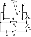 如圖所示電路,M、N是一對間距為d的平行金屬板,且將N板接地.已知電源電動勢E=36伏,內(nèi)阻不計,R0=200 Ω為定值電阻,R1、R2均為0-999.9 Ω的可調(diào)電阻箱,用兩根絕緣細(xì)線將質(zhì)量為m、帶少量負(fù)電的小球懸于平行金屬板內(nèi)部.已知細(xì)線s水平,線長s=d/3.閉合電鍵k,若僅將R1從200 Ω調(diào)到400 Ω,則兩狀態(tài)小球電勢能之比為________;若僅將R2從200 Ω調(diào)到400 Ω,則兩狀態(tài)小球電勢能之比為________.