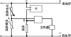下圖是熱水器系統(tǒng)的恒溫器集成電路,當(dāng)溫度低時(shí),熱敏電阻的阻值很大,溫度高時(shí)熱敏電阻的阻值就很小,只有當(dāng)熱水器中有水且水的溫度低時(shí),發(fā)熱器才會(huì)開啟并加熱;反之,便會(huì)關(guān)掉發(fā)熱器.如果熱水器中沒有水時(shí),電路中B點(diǎn)處于________電勢(填“高”或“低”),這個(gè)邏輯電路是________門電路.