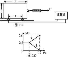 如圖(1)所示,均勻長方體木塊長b=18 cm,高h=16 cm,寬L=10 cm,被兩個力傳感器支撐起來,兩傳感器間距為a=10 cm且到木塊兩邊的距離相等,傳感器能夠將支撐點的受力情況通過數據采集器在計算機屏幕上反映出來.現用一彈簧測力計水平拉木塊,拉力作用在木塊的中點且緩慢均勻增大,木塊則始終保持靜止狀態(tài),計算機屏上出現如圖(2)所示的圖線.問: