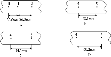 他已在每條紙帶上按每5個(gè)點(diǎn)取好一個(gè)計(jì)數(shù)點(diǎn),即兩計(jì)數(shù)點(diǎn)之間的時(shí)間間隔為0.1s,依打點(diǎn)先后編為0、1、2、3、4、5.由于不小心,幾條紙帶都被撕斷了,如圖所示.請(qǐng)根據(jù)給出的A、B、C、D四段紙帶回答:在B、C、D三段紙帶中選出從紙帶A上撕下的那段應(yīng)該是________;打A紙帶時(shí),物體的加速度大小是________m/s2.