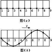 在均勻介質(zhì)中選取平衡位置在同一直線(xiàn)上的9個(gè)質(zhì)點(diǎn),相鄰兩質(zhì)點(diǎn)的距離均為L(zhǎng),如圖(a)所示.一列橫波沿該直線(xiàn)向右傳播,t=0時(shí)到達(dá)質(zhì)點(diǎn)1,質(zhì)點(diǎn)1開(kāi)始向下運(yùn)動(dòng),經(jīng)過(guò)時(shí)間Δt第一次出現(xiàn)如圖(b)所示的波形.則該波的周期、波長(zhǎng)和波速各為多少?