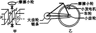 曾經(jīng)流行過一種向自行車車頭燈供電的小型交流發(fā)電機(jī),圖甲為其結(jié)構(gòu)示意圖.圖中N、S是一對(duì)固定的磁極,abcd為固定在轉(zhuǎn)軸上的矩形線框,轉(zhuǎn)軸過bc邊中點(diǎn)、與ab邊平行,它的一端有一半徑r0=1.0 cm的摩擦小輪,小輪與自行車車輪的邊緣相接觸,如圖乙所示.當(dāng)車輪轉(zhuǎn)動(dòng)時(shí),因摩擦而帶動(dòng)小輪轉(zhuǎn)動(dòng),從而使線框在磁極間轉(zhuǎn)動(dòng).設(shè)線框由N=800匝導(dǎo)線圈組成,每匝線圈的面積S=20 cm2,磁極間的磁場(chǎng)可視為勻強(qiáng)磁場(chǎng),磁感強(qiáng)度B=0.010 T,自行車車輪的半徑R1=35 cm,小齒輪的半徑R2=4.0 cm,大齒輪的半徑R3=10.0 cm(見圖乙).現(xiàn)從靜止開始使大齒輪加速運(yùn)動(dòng),問大齒輪的角速度為多大時(shí)才能使發(fā)電機(jī)輸出電壓的有效值U=3.2 V?(假定摩擦小輪與自行車輪之間無相對(duì)滑動(dòng))