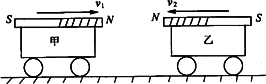 如圖所示,將兩條完全相同的磁鐵(磁性極強(qiáng))分別固定在質(zhì)量相等的小車上,水平面光滑.開(kāi)始時(shí)甲車速度大小為3 m/s,乙車速度大小為2 m/s,方向相反并同在一條直線上.