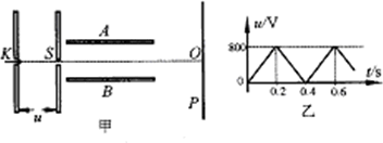 如圖甲所示,真空中的電極K連續(xù)不斷地發(fā)出電子(電子的初速度可忽略不計(jì)),經(jīng)電壓為u的電場加速,加速電壓u隨時(shí)間t變化的圖象如圖乙所示.每個(gè)電子通過加速電場的過程時(shí)間極短,可認(rèn)為加速電壓不變.電子被加速后由小孔S穿出,沿兩個(gè)彼此靠近且正對的水平金屬板A、B間中軸線從左邊緣射入A、B兩間的偏轉(zhuǎn)電場,A、B兩板長均為L=0.20m,兩板之間距離d=0.050m,A板的電比B板的電勢高.A、B板右側(cè)邊緣到豎直放置的熒光屏P(面積足夠大)之間的距離b=0.10m,熒光屏的中心點(diǎn)O與A、B板的中心軸線在同一水平直線上.不計(jì)電子之間的相互作用力用其所受重力,求: