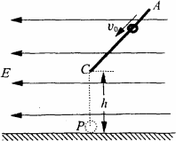 如圖所示,在水平方向的勻強(qiáng)電場(chǎng)中有一表面光滑、與水平面成45°角的絕緣直桿AC,其下端(C端)距地面高度h=0.8 m.有一質(zhì)量500 g的帶電小環(huán)套在直桿上,正以某一速度,沿桿勻速下滑,小環(huán)離桿后正好通過(guò)C端的正下方P點(diǎn)處.(g取l0 m/s2)求: