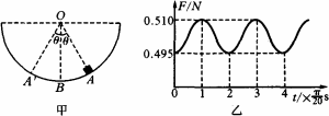,均小于10°,圖乙表示滑塊對器壁的壓力F隨時間t變化的曲線,且圖中t=0為滑塊從A點開始運動的時刻.試根據(jù)力學(xué)規(guī)律和題中(包括圖中)所給的信息,求小滑塊的質(zhì)量、容器的半徑及滑塊運動過程中的守恒量.(g取10 m/s2)