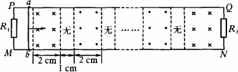 平行軌道PQ、MN兩端各接一個(gè)阻值R1=R2=8 Ω的電熱絲,軌道間距L=1 m,軌道很長,本身電阻不計(jì),軌道間磁場按如圖所示的規(guī)律分布,其中每段垂直紙面向里和向外的磁場區(qū)域?qū)挾葹? cm,磁感應(yīng)強(qiáng)度的大小均為B=1 T,每段無磁場的區(qū)域?qū)挾葹? cm,導(dǎo)體棒ab本身電阻r=1 Ω,與軌道接觸良好,現(xiàn)讓ab以v=10 m/s的速度向右勻速運(yùn)動(dòng).求: