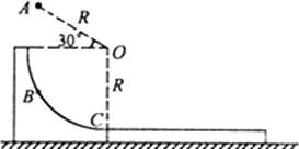 如圖所示,半徑R=0.8 m的光滑1/4圓弧軌道固定在光滑水平上,軌道上方的A點(diǎn)有一個(gè)可視為質(zhì)點(diǎn)的質(zhì)量m=1 kg的小物塊.小物塊由靜止開(kāi)始下落后打在圓弧軌道上的B點(diǎn)但未反彈,在該瞬間碰撞過(guò)程中,小物塊沿半徑方向的分速度即刻減為零,而沿切線方向的分速度不變,此后小物塊將沿著圓弧軌道滑下.已知A點(diǎn)與軌道的圓心O的連線長(zhǎng)也為R,且AO連線與水平方向的夾角為30°,C點(diǎn)為圓弧軌道的末端,緊靠C點(diǎn)有一質(zhì)量M=3 kg的長(zhǎng)木板,木板的上表面與圓弧軌道末端的切線相平,小物塊與木板間的動(dòng)摩擦因數(shù)μ=0.3,g取10 m/s2.求: