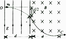 如圖所示,勻強(qiáng)電場(chǎng)區(qū)域和勻強(qiáng)磁場(chǎng)區(qū)域是緊鄰的,且寬度相等均為d,電場(chǎng)方向在紙平面內(nèi),而磁場(chǎng)方向垂直紙面向里.一帶正電粒子從O點(diǎn)以速度v0沿垂直電場(chǎng)方向進(jìn)入電場(chǎng),在電場(chǎng)力的作用下發(fā)生偏轉(zhuǎn),從A點(diǎn)離開(kāi)電場(chǎng)進(jìn)入磁場(chǎng),離開(kāi)電場(chǎng)時(shí)帶電粒子在電場(chǎng)方向的位移為電場(chǎng)寬度的一半,當(dāng)粒子從C點(diǎn)穿出磁場(chǎng)時(shí)速度方向與進(jìn)入電場(chǎng)O點(diǎn)時(shí)的速度方向一致,(帶電粒子重力不計(jì))求: