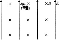 如圖所示,在足夠大的空間范圍內(nèi),同時(shí)存在著豎直向上的勻強(qiáng)電場(chǎng)和垂直紙面向里的水平勻強(qiáng)磁場(chǎng),磁感應(yīng)強(qiáng)度B=1.57 T.小球1帶正電,其電量與質(zhì)量之比q1/m1=4 C/kg,所受重力與電場(chǎng)力的大小相等;小球2不帶電,靜止放置于固定的水平懸空支架上.小球1向右以υ0=23.59 m/s的水平速度與小球2正碰,碰后經(jīng)過(guò)0.75 s再次相碰.設(shè)碰撞前后兩小球帶電情況不發(fā)生改變,且始終保持在同一豎直平面內(nèi).(取g=10 m/s2)