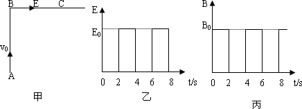 如圖甲所示,在空間存在一個變化的電場和一個變化的磁場,電場的方向水平向右(圖中由B到C),場強大小隨時間變化如圖乙所示;磁感強度方向垂直于紙面、大小隨時間如圖丙所示.從t=1 s末開始,在A點每隔2 s有一個同種的粒子以沿AB方向(垂直于BC)的初速度v0射擊,恰好能擊中C點,若AB=BC=l,且粒子在AC間的運動時間小于1 s.求: