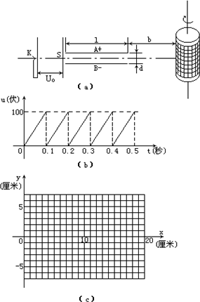 如圖(a)所示,真空室中電極K發(fā)出的電子(初速不計)經(jīng)過U0=1000 v的加速電場后,由小孔S沿兩水平金屬板A,B間的中心線射入.A,B板長l=0.20 m,相距d=0.020 m,加在A、B兩板間的電壓u隨時間t變化的u-t圖線如圖(b)所示.設(shè)A,B間的電場可看作是均勻的,且兩板外無電場.在每個電子通過電場區(qū)域的極短時間內(nèi),電場可視作恒定的.兩板右側(cè)放一記錄圓筒,筒的左側(cè)邊緣與極板右端距離b=0.15 m,筒繞其豎直軸勻速轉(zhuǎn)動,周期T=0.20 s,筒的周長s=0.20 m,筒能接收到通過A,B板的全部電子.