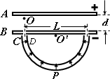 如圖所示,A、B為兩塊平行金屬板,A板帶正電、B板帶負(fù)電.兩板之間存在著勻強(qiáng)電場(chǎng),兩板間距為d、電勢(shì)差為U,在B板上開有兩個(gè)間距為L的小孔.C、D為兩塊同心半圓形金屬板,圓心都在貼近B板的