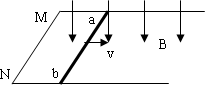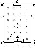 下圖中MN和PQ為豎直方向的兩平行長直金屬導軌,間距l為0.40 m,電阻不計.導軌所在平面與磁感應強度B為0.50 T的勻強磁場垂直.質(zhì)量m為6.0×10-3 kg.電阻為1.0 Ω的金屬桿ab始終垂直于導軌,并與其保持光滑接觸.導軌兩端分別接有滑動變阻器和阻值為3.0 Ω的電阻R1.當桿ab達到穩(wěn)定狀態(tài)時以速率v勻速下滑,整個電路消耗的電功率P為0.27 W,重力加速度取10 m/s2,試求速率v和滑動變阻器接入電路部分的阻值R2.